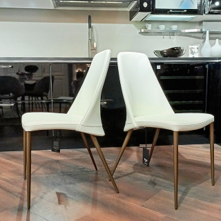 Elmo - оригинальный стул с фигурной спинкой. Итальянское производство Tonin Casa. За счет высокой и немного изогнутой спинки, стул невероятно удобен и комфортабелен. Обивка натуральная кожа в цвете Panna. Ножки металл в цвете бронзовый камень. В наличии два стула. Доставка по всей России.