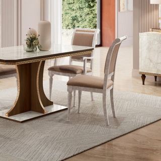 Сул который Romantica дополняет функциональность столовой и придает нотку формальной изысканности всей обстановке. Он сохраняет полную стилистическую согласованность с остальной частью коллекции, сочетая классическую атмосферу с более современным настроением. Изготовлен из бука и покрыт изысканными тканями, он передает ощущение комфорта и уюта.