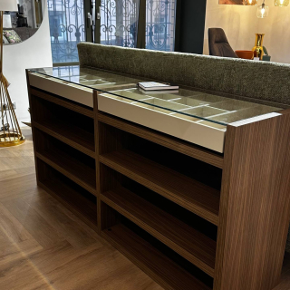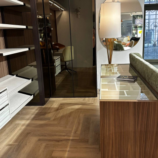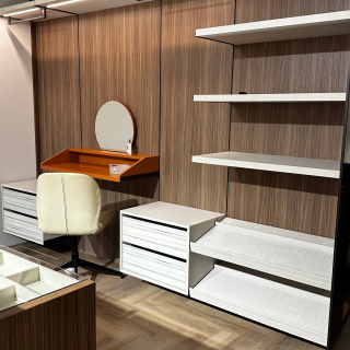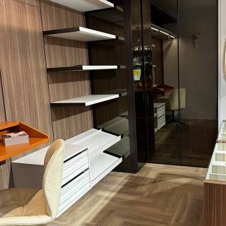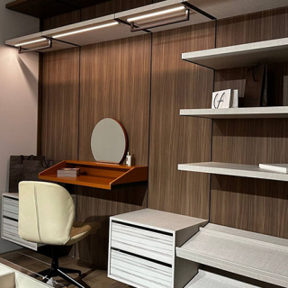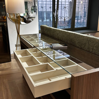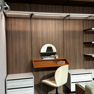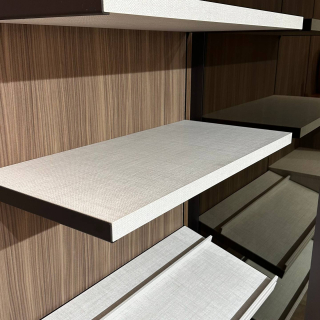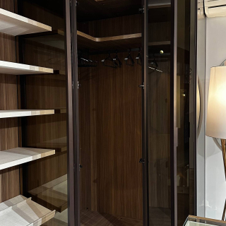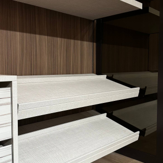 Гардеробная от бренда Giessegi — это гармония итальянского стиля и функциональности. Корпус из ДСП в оттенке «Орех» и фасады из стекла Reflex создают ощущение лёгкости и утончённости. Выдвижные ящики с стеклом Zebrano добавляют современный акцент и подчеркивают премиальный характер мебели.