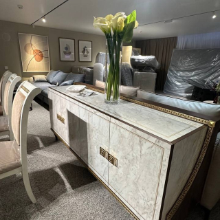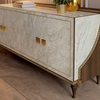 Буфет с 4 дверцами отражает очаровательную атмосферу столовой Romantica. Каждая деталь, от боковин с эффектом древесины ореха до внутренней отделки из глянцевого каррарского мрамора, призвана очаровывать. Ручки с 24-каратным золотым напылением и золотые неоклассические накладки придают изделию соблазнительность и роскошь. Этот предмет мебели превращает столовую в пространство, где искусство дизайна от Arredoclassic сочетается с непревзойденной практичностью.