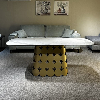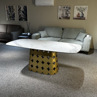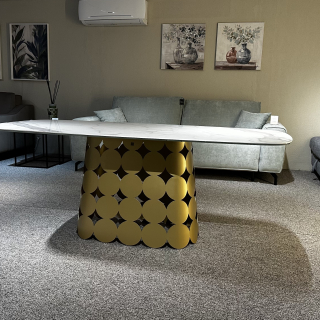 Стол имеет необычное основание, где играют свет и тень, точно так же, как лучи солнца проникают в листья растений. Цвет основания – матовое золото.