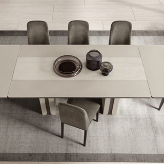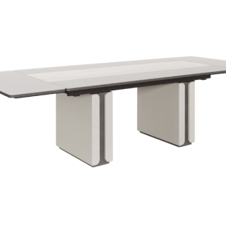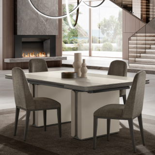 Столешница из стекла с матовым покрытием в пудровых тонах в прямоугольных столах Perla перекликается с дверцами других элементов интерьера гостиной. Центральная полоса выполнена в отделке под травертин, что придает ей глубину и выразительность.